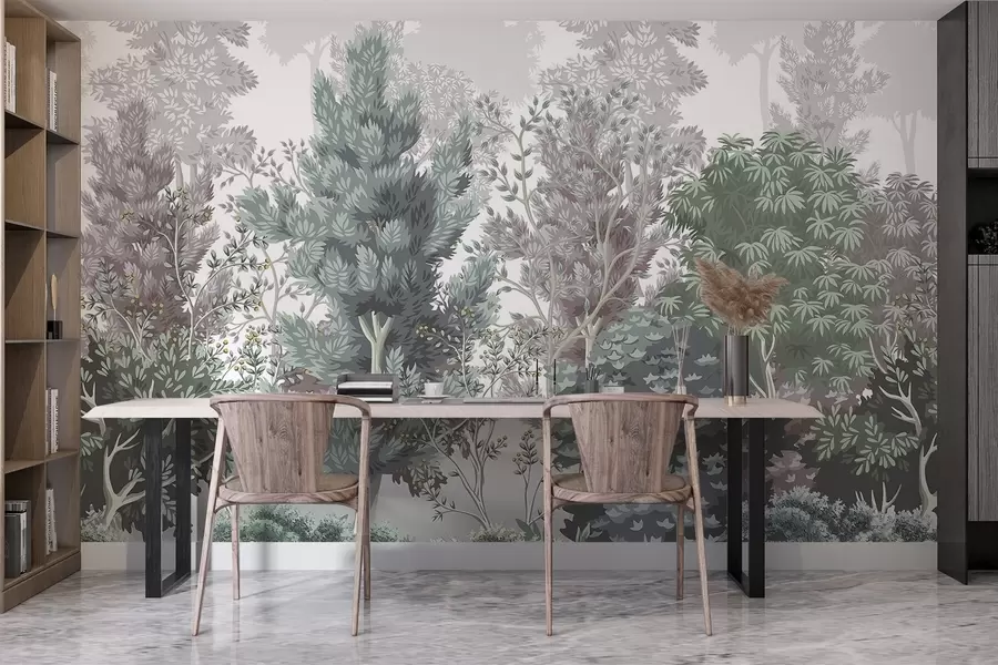 Un bosque exuberante y verde con varios tipos de árboles y arbustos de hoja perenne, ricos verdes del otro follaje gris