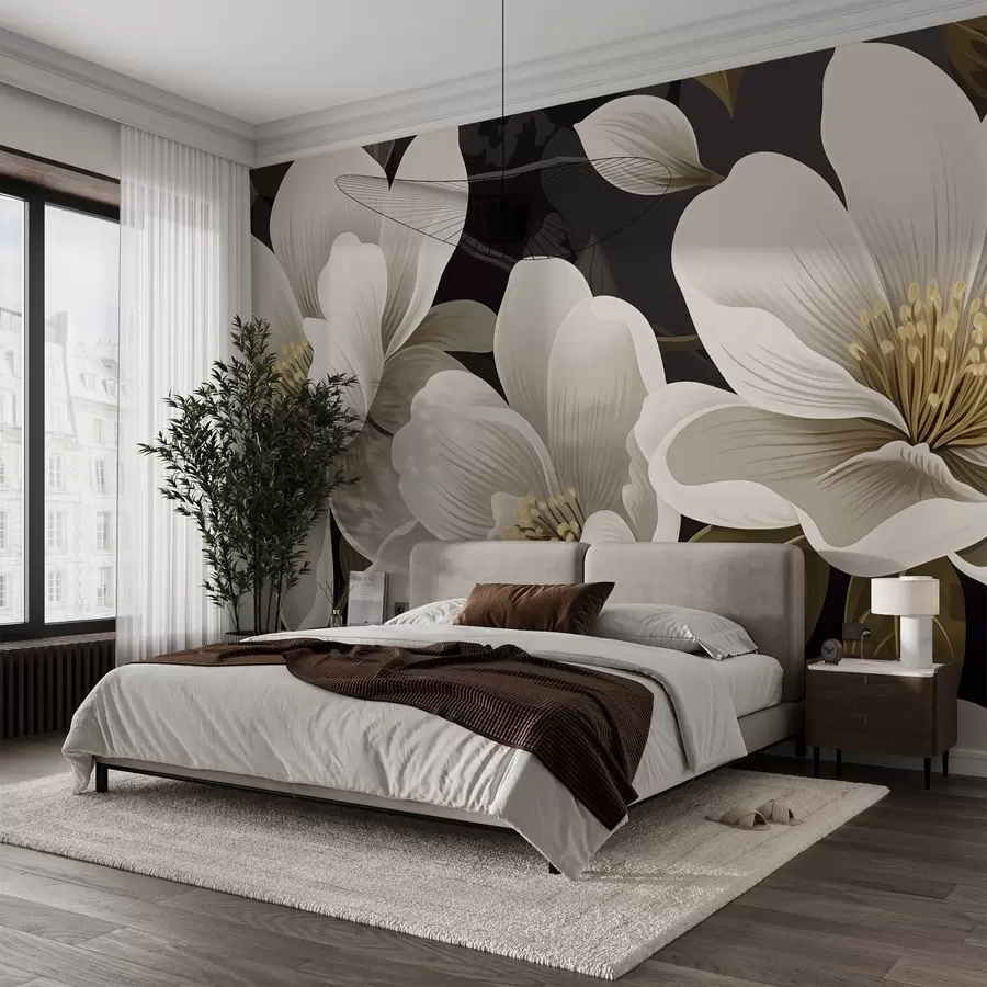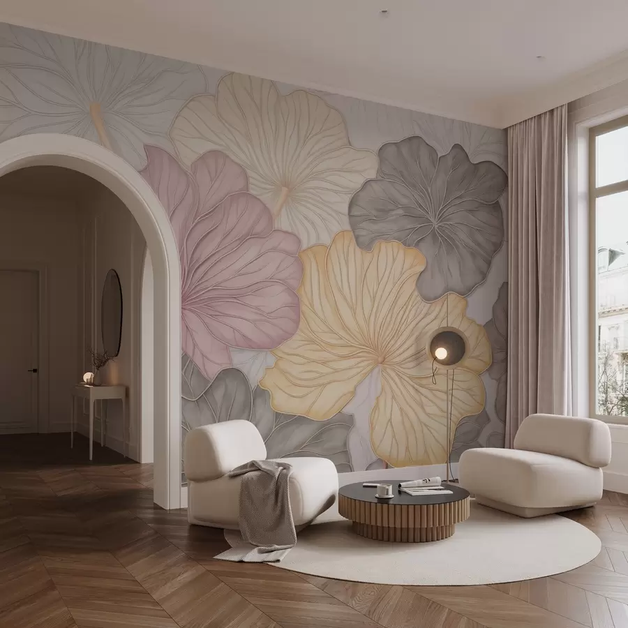 Flores abstractas translúcidas, círculos y formas geométricas, paleta de colores azul pastel, beige y blanco