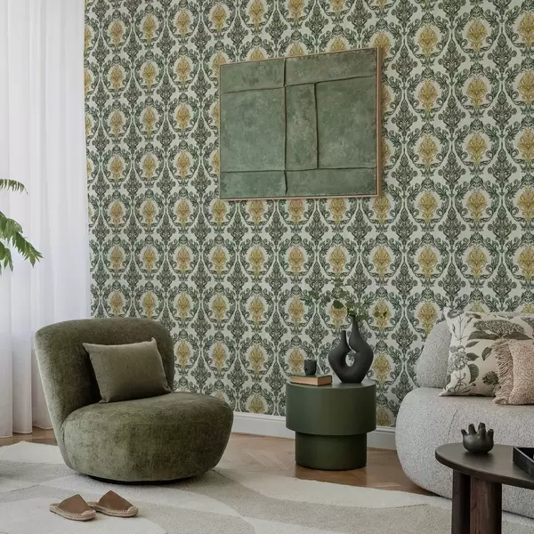 Papel pintado Damasco con volutas verdes sobre fondo claro. a00828v1