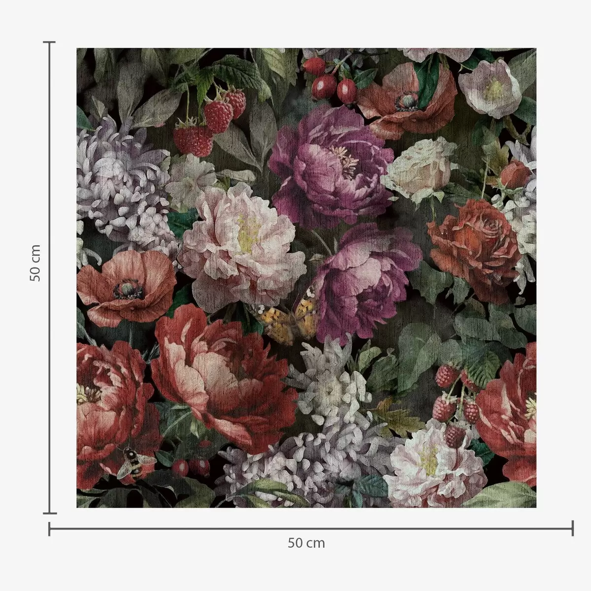 Papel tapiz Peonías oscuras y dramáticas, bayas y mariposa sobre fondo negro. Nr. a00862