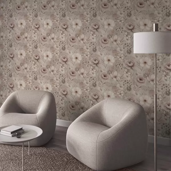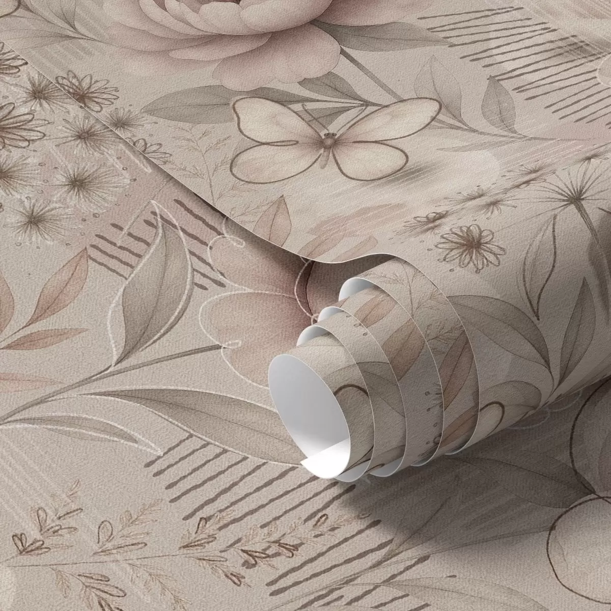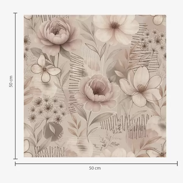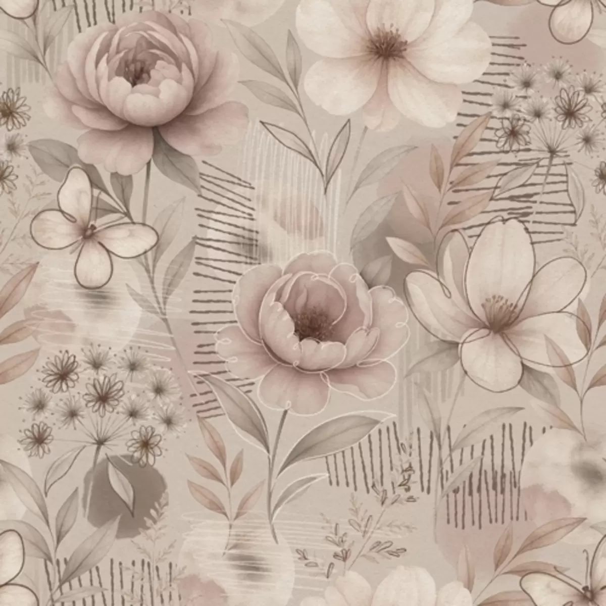 Fotomurales Estampado floral en tonos beige sepia con detalles lineales y mariposas. Nr. a00870