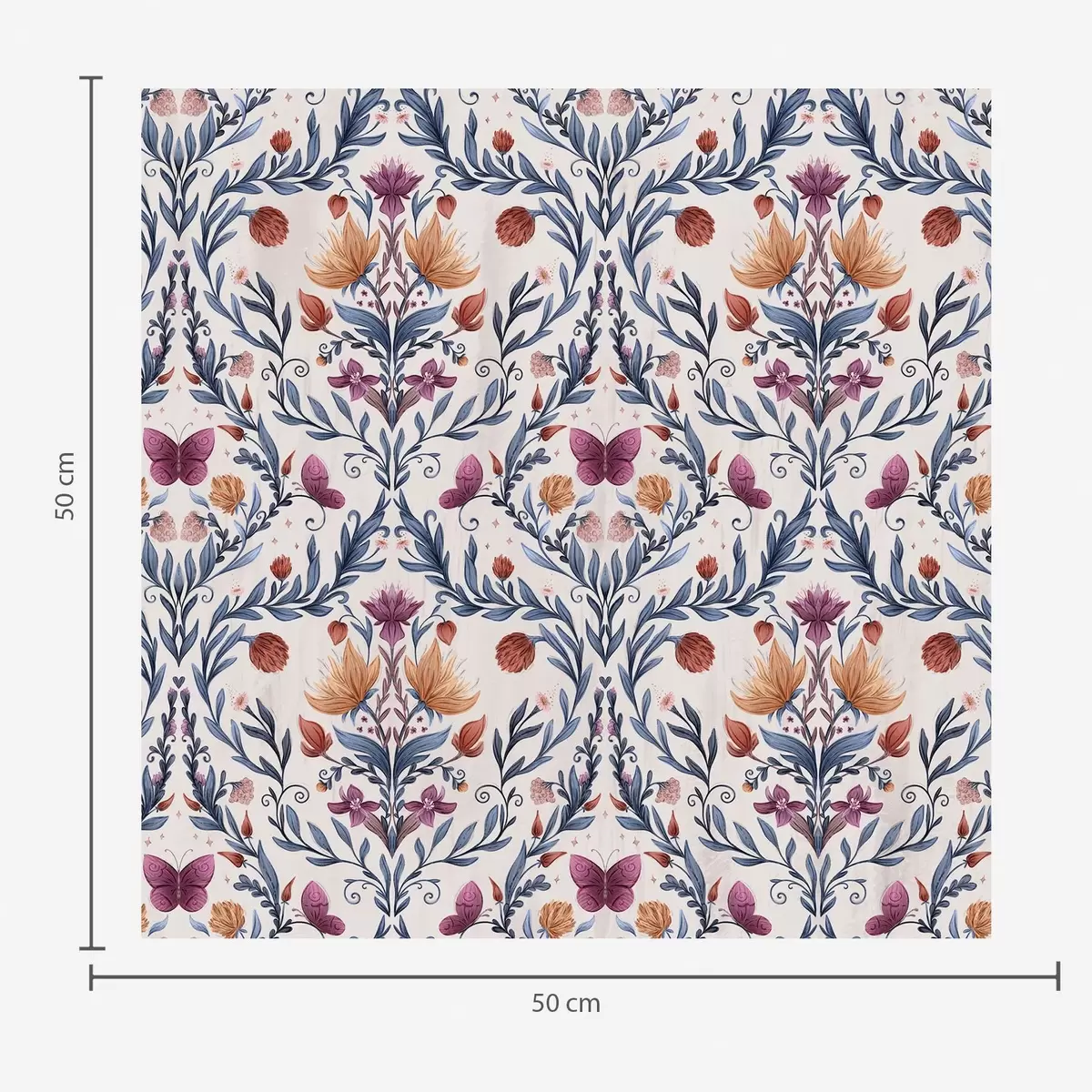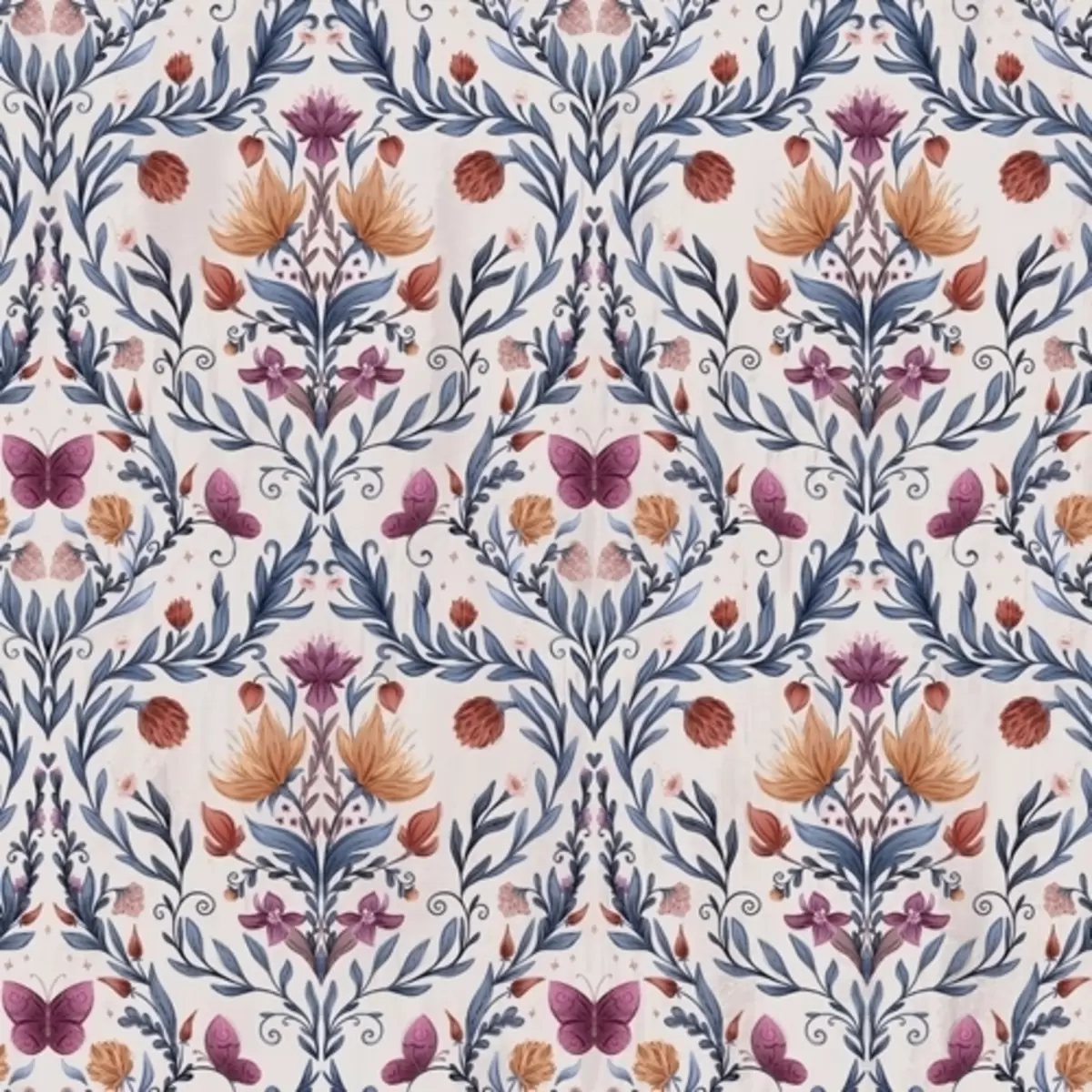 Fotomurales Damasco floral con mariposas en azul marino y terracota sobre fondo blanco. Nr. a00926v1