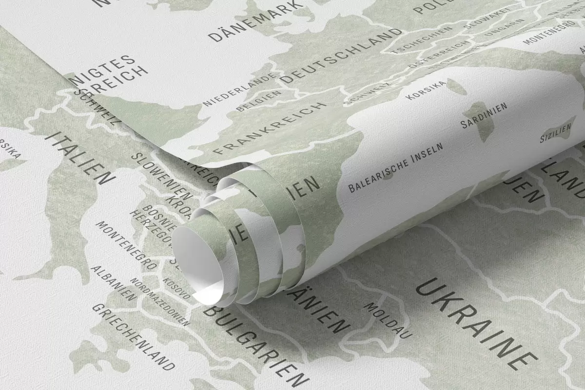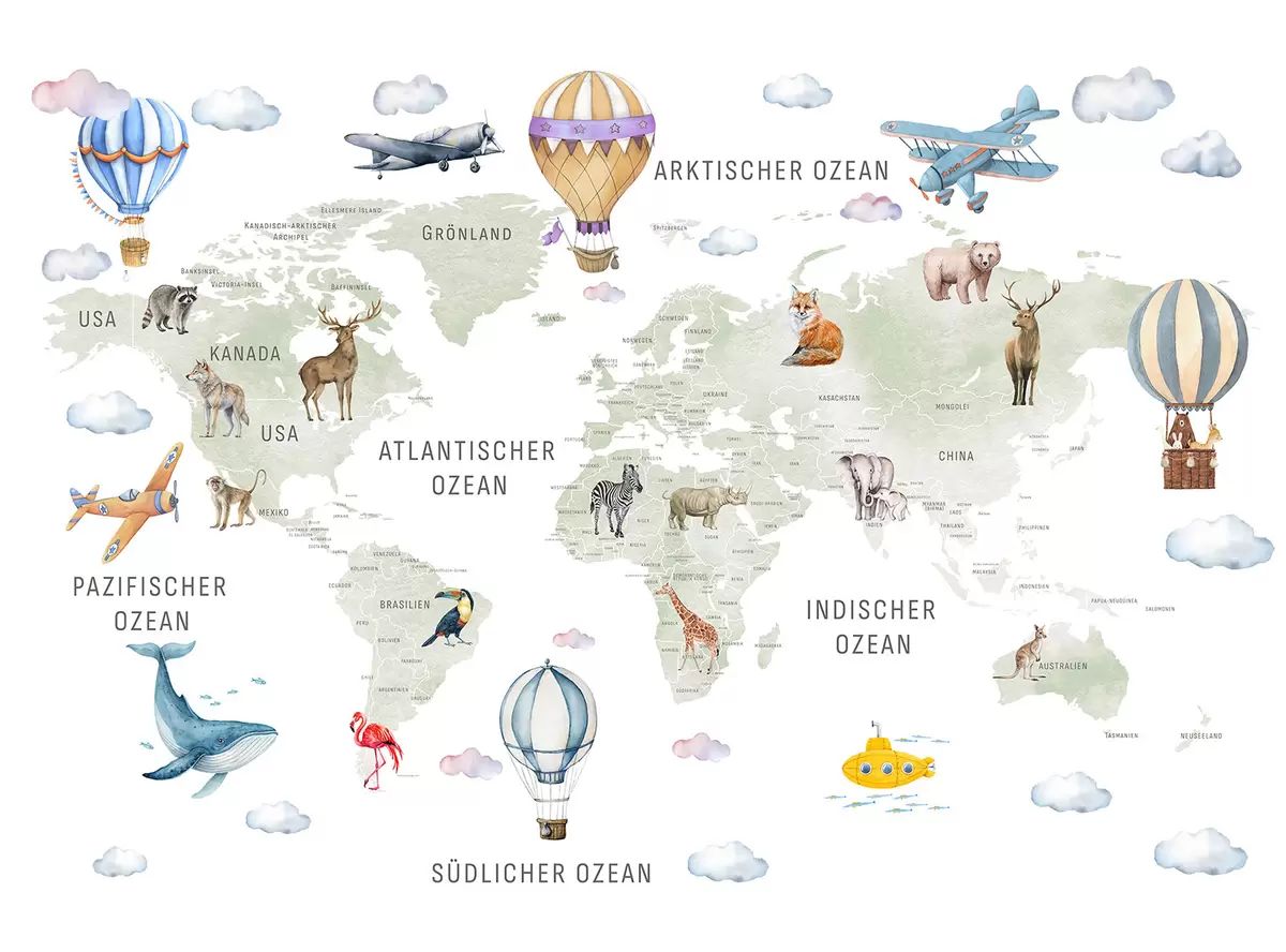 Fotomurales Mapa infantil en estilo acuarela con animales y globos aerostáticos. En alemán. Color verde. Nr. c00001de