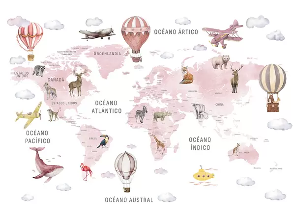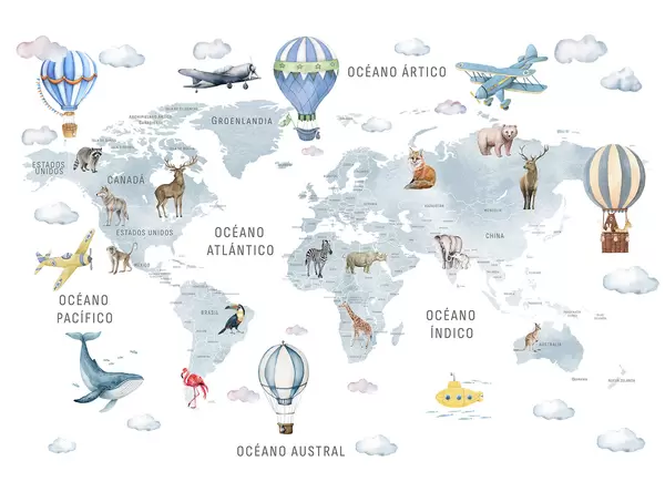 Fotomurales Mapa infantil en estilo acuarela con animales y globos aerostáticos. En español. Color azul. Nr. c00001esv1
