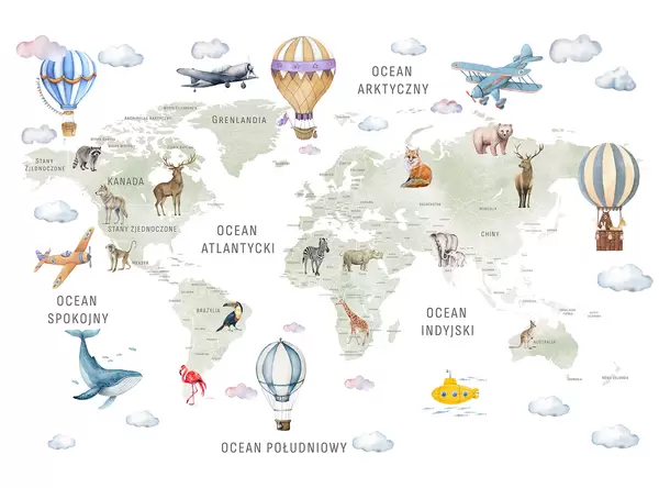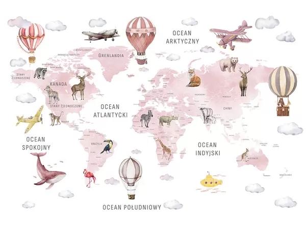 Fotomurales Mapa infantil en estilo acuarela con animales y globos aerostáticos. Idioma polaco. Color rosa. Nr. c00001plv3