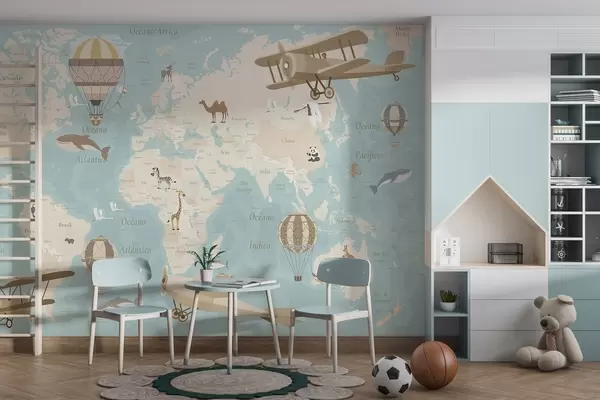Fotomurales Mapa mundial infantil con animales, aviones y globos aerostáticos. En español. Color azul. Nr. c00003esv1