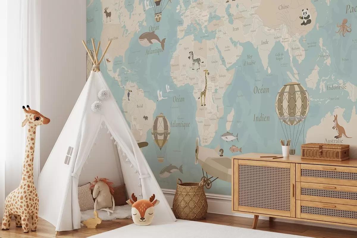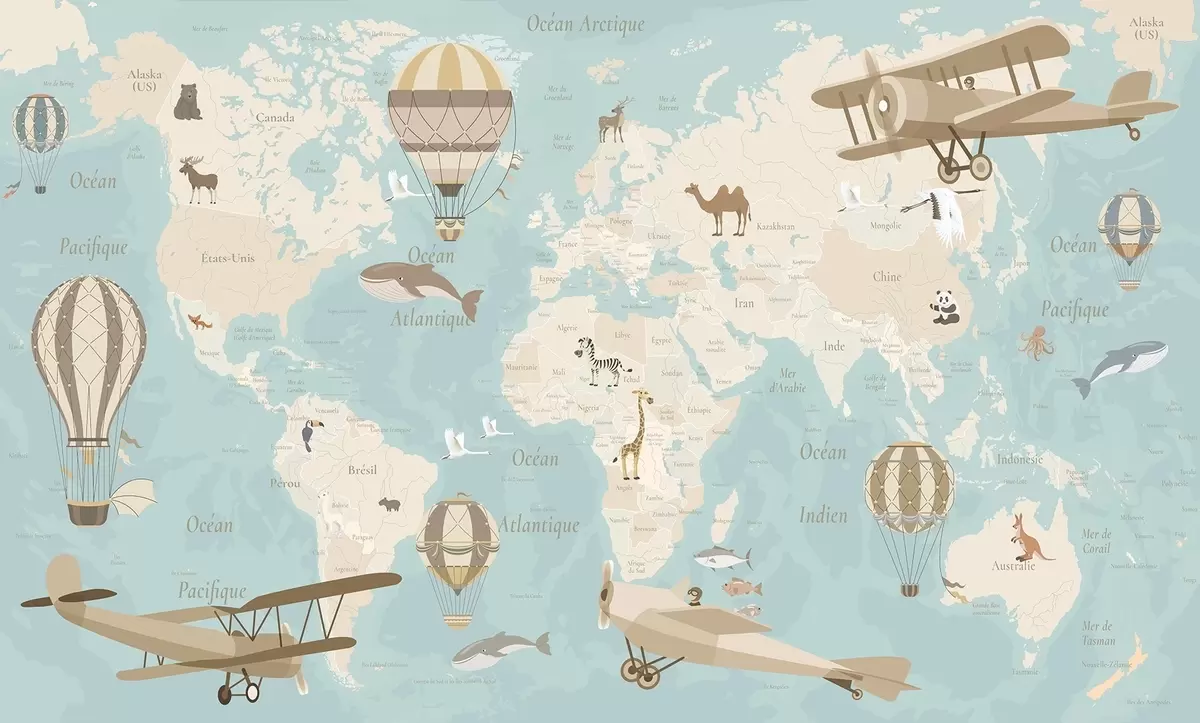 Fotomurales Mapa mundial infantil con animales, aviones y globos aerostáticos. Idioma francés. Color azul. Nr. c00003frv1