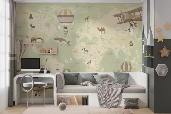 Fotomurales Mapa mundial infantil con animales, aviones y globos aerostáticos. Idioma polaco. Color verde. Nr. c00003plv2