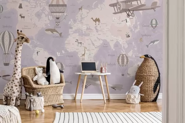 Fotomurales Mapa mundial infantil con animales, aviones y globos aerostáticos. Idioma polaco. Color morado. Nr. c00003plv4
