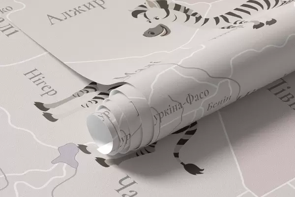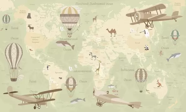 Fotomurales Mapa mundial infantil con animales, aviones y globos aerostáticos. Idioma ucraniano. Color morado. Nr. c00003ukv4