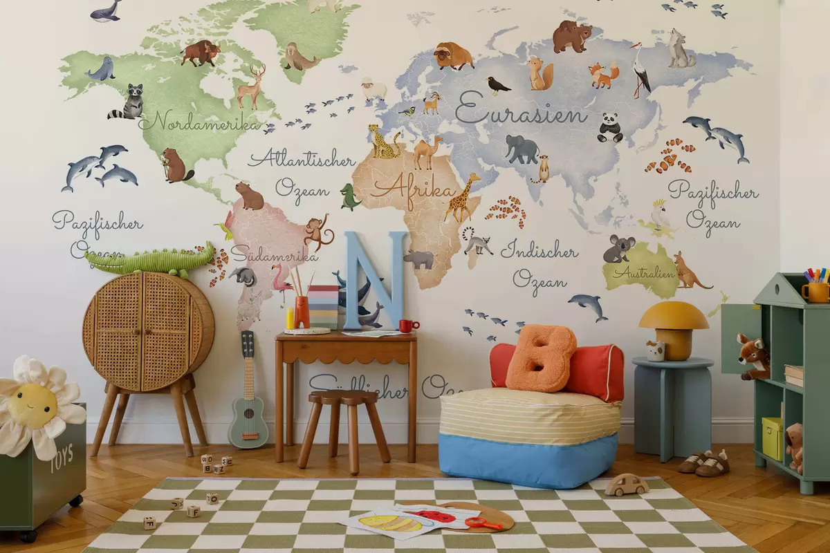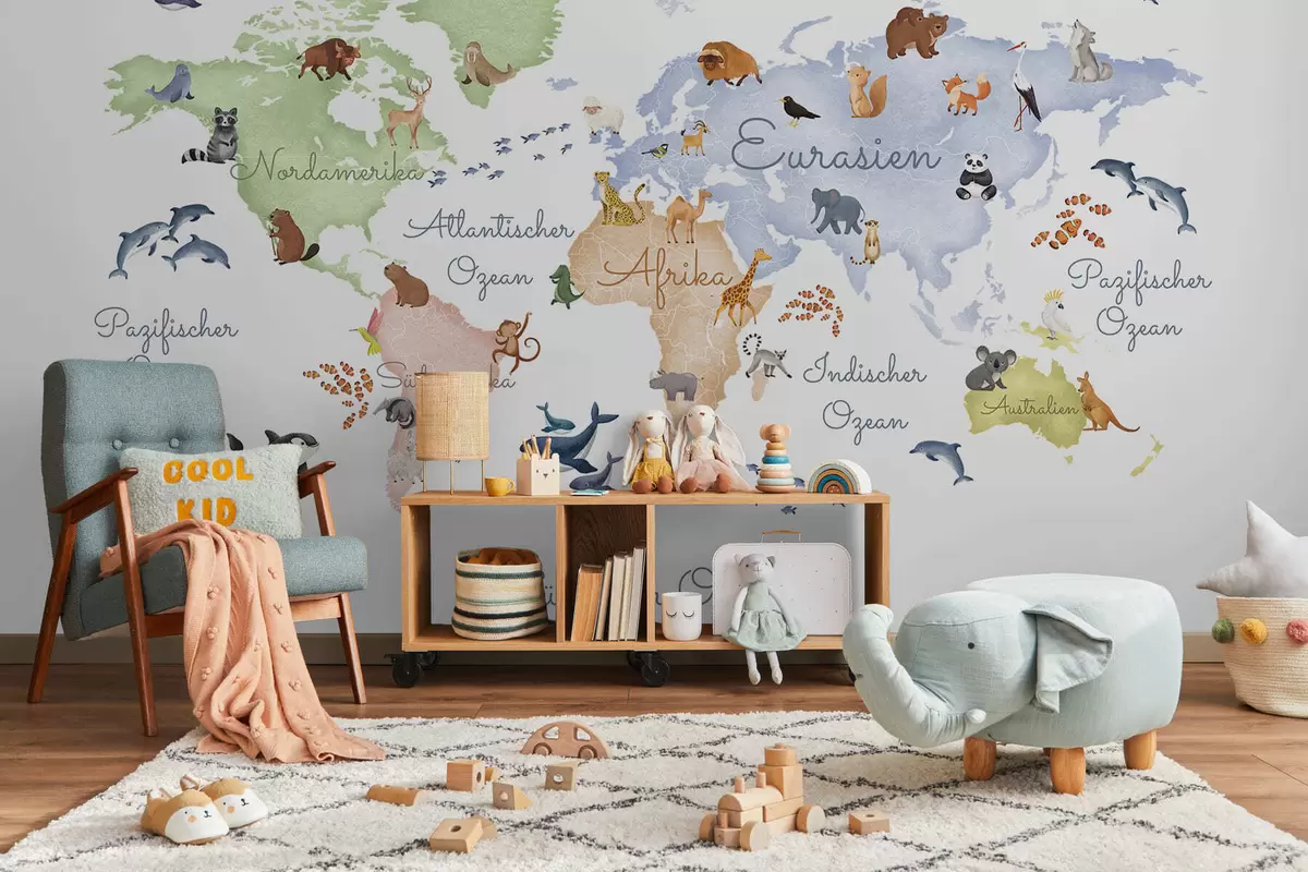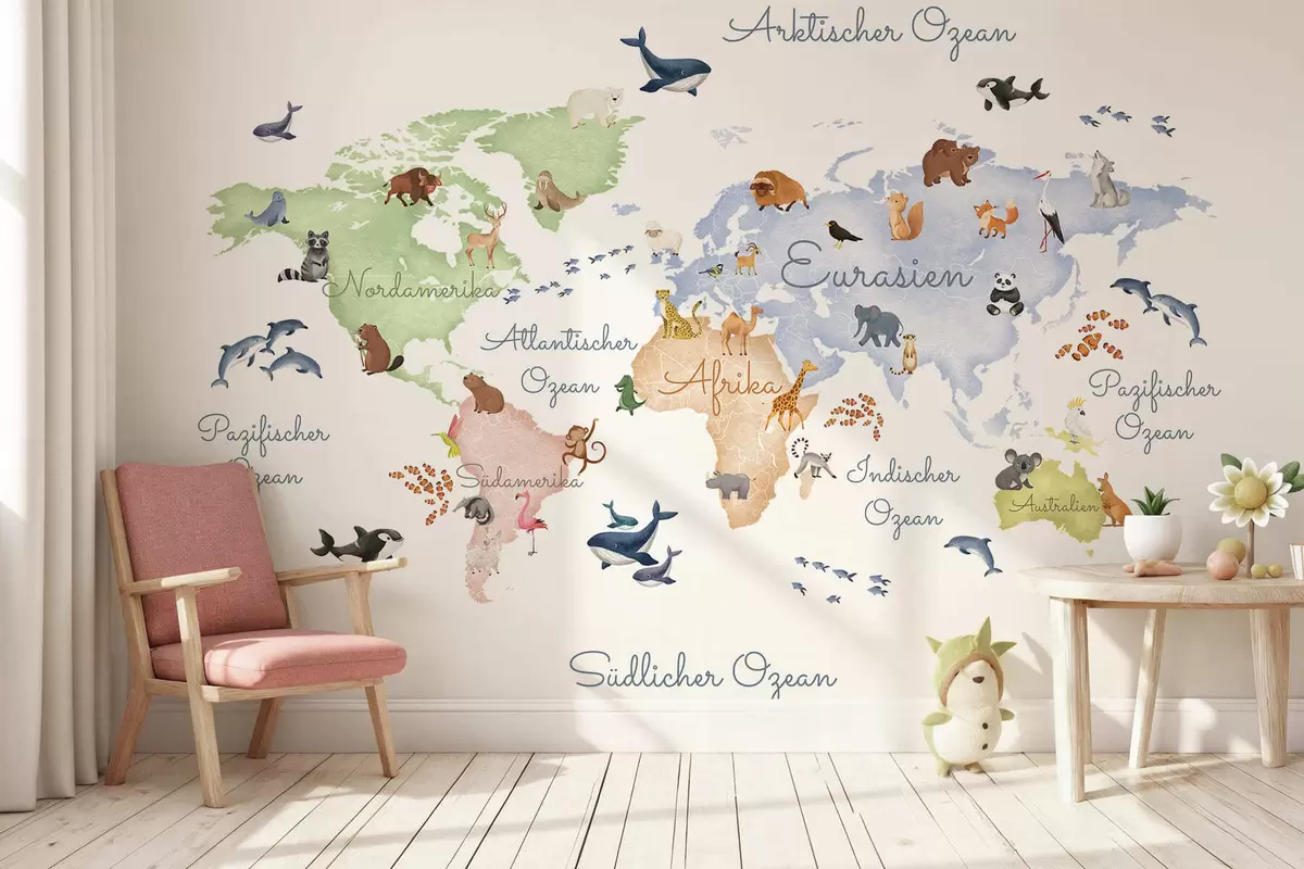 Fotomurales Un mapa de White en estilo acuarela con animales. Etiquetas en alemán Nr. c00012de