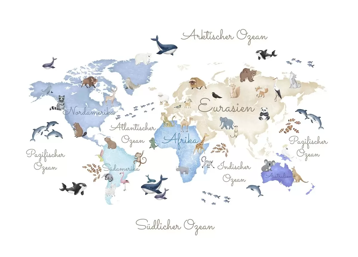 Fotomurales Un mapa azul de estilo acuarela con animales. Etiquetas en alemán Nr. c00012dev1