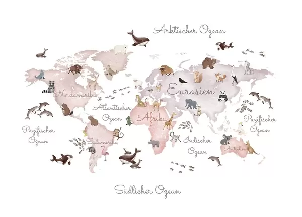 Fotomurales Un mapa en tonos beige, con un estilo de acuarela, en el que aparecen animales. Rótulos en alemán Nr. c00012dev3