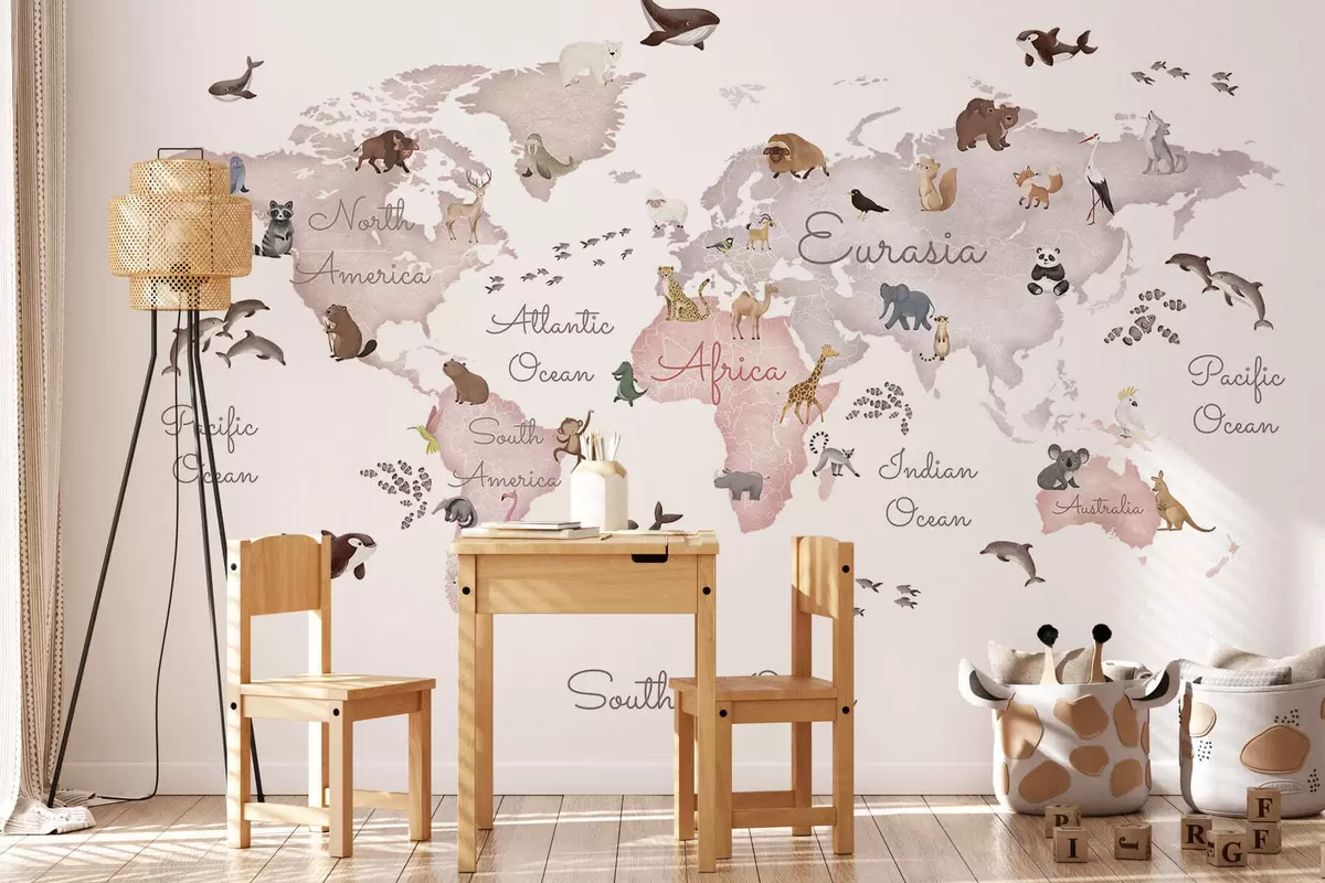 Fotomurales Un mapa en tonos beige, con un estilo de acuarela, en el que aparecen animales. Rótulos en inglés Nr. c00012env3
