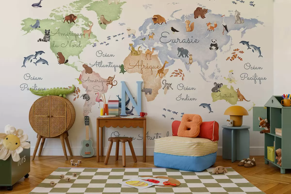Fotomurales Un mapa a color con estilo de acuarela en el que aparecen animales. Etiquetas en francés Nr. c00012fr