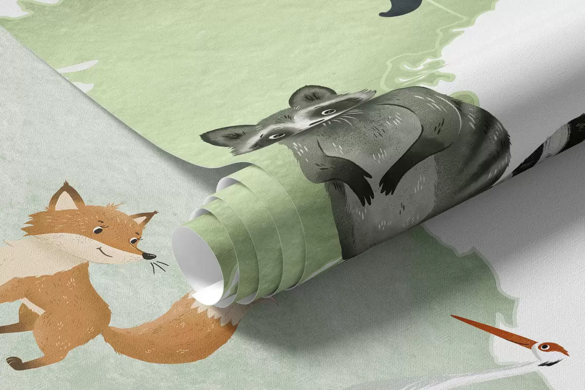 Fotomurales Un mapa verde de estilo acuarela con animales. Etiquetas en francés Nr. c00012frv2