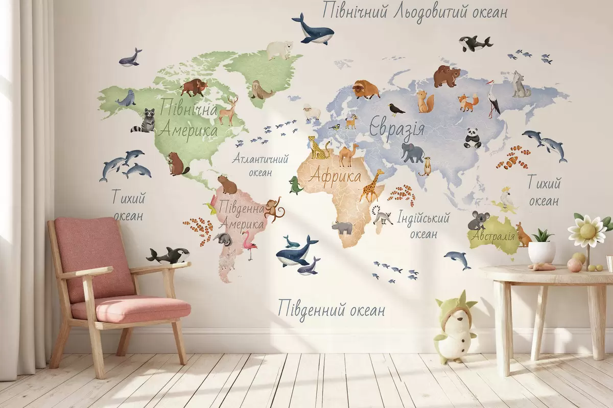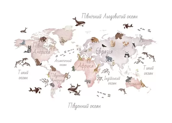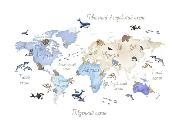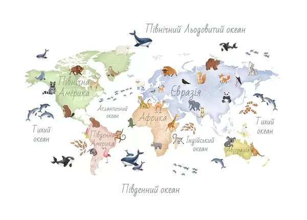 Fotomurales Un mapa a color con estilo de acuarela en el que aparecen animales. Etiquetas en ucraniano Nr. c00012uk