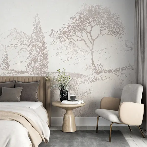 Fotomurales Paisaje de Toscana, árbol, campo, minimalismo, colores beige naturales Nr. u99570