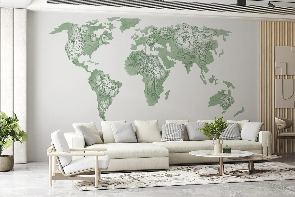 Fotomurales Mapamundi floral, ornamental, peonías, lirio, color verde, dibujo lineal arte Nr. u99734v3