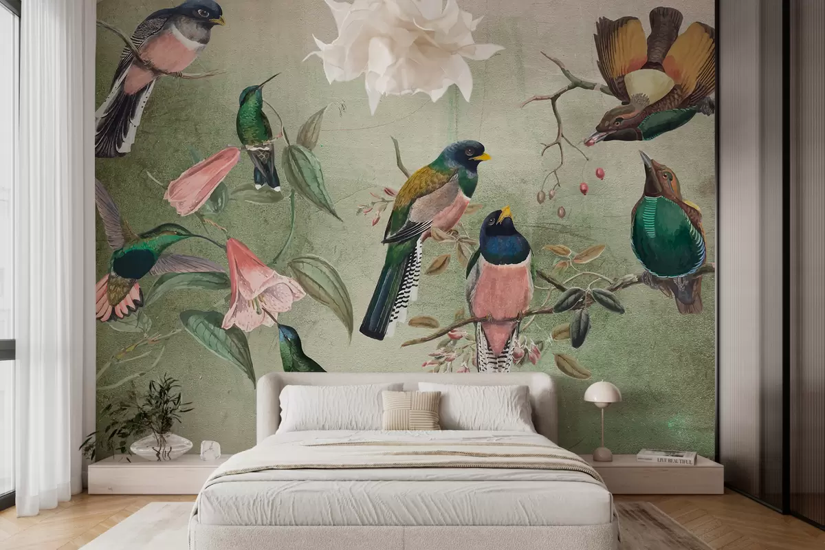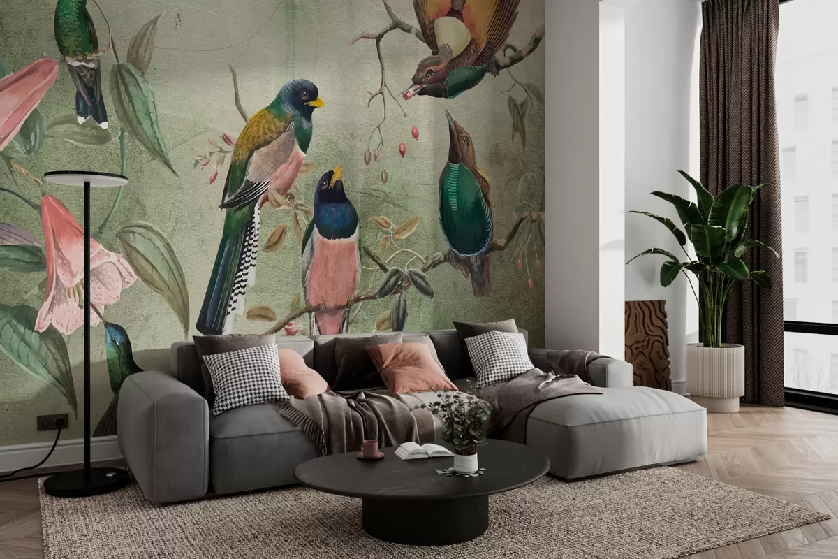 Fotomurales Un grupo de pájaros coloridos posados en ramas en el fondo texturizado Nr. w00543