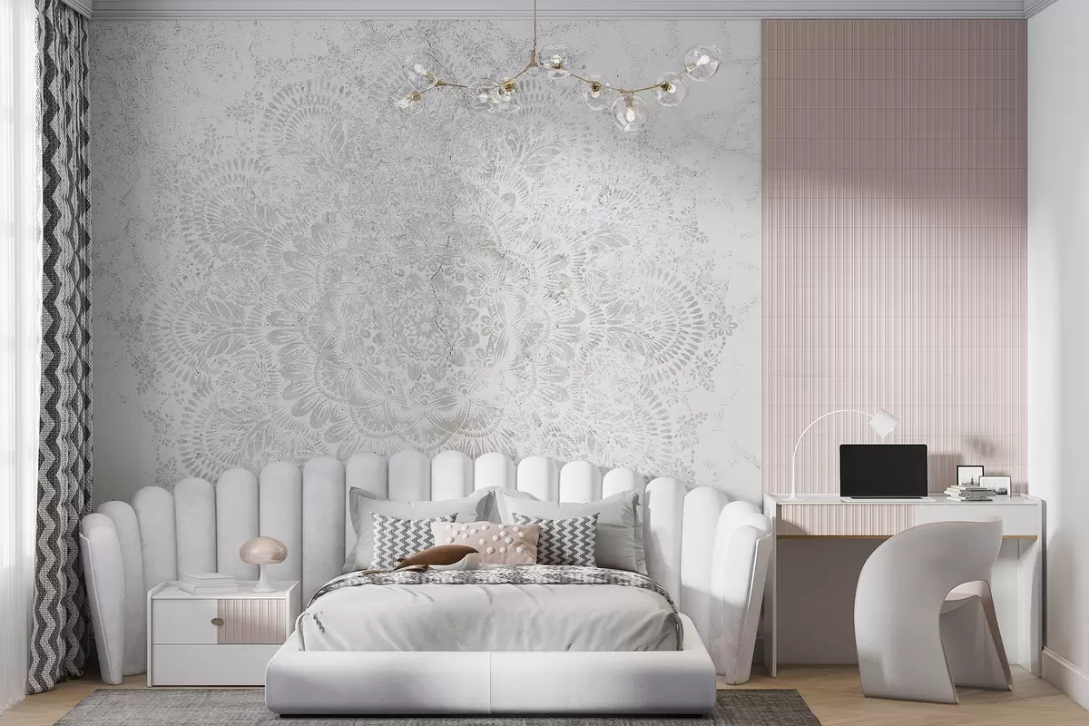Fotomurales Mandala, patrón de encaje blanco con motivos florales y circulares, creando un diseño delicado e intrincado Nr. w00737