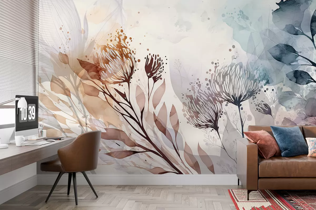 Fotomurales Delicados elementos florales abstractos, flores estilizadas y formas vegetales en tonos apagados y terrosos, arte acuarela Nr. w00898