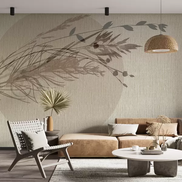 Fotomurales Una ilustración minimalista de una forma circular con elementos abstractos parecidos a plantas en tonos tierra apagados Nr. w00902