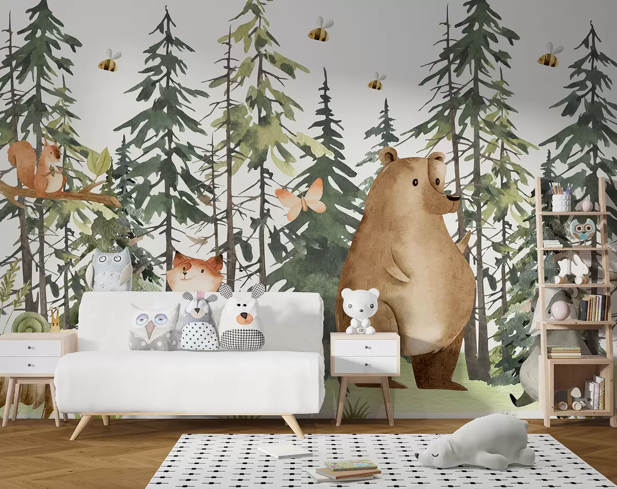 Fotomurales Una escena de bosque con animales y varios pinos al fondo. Nr. w00905