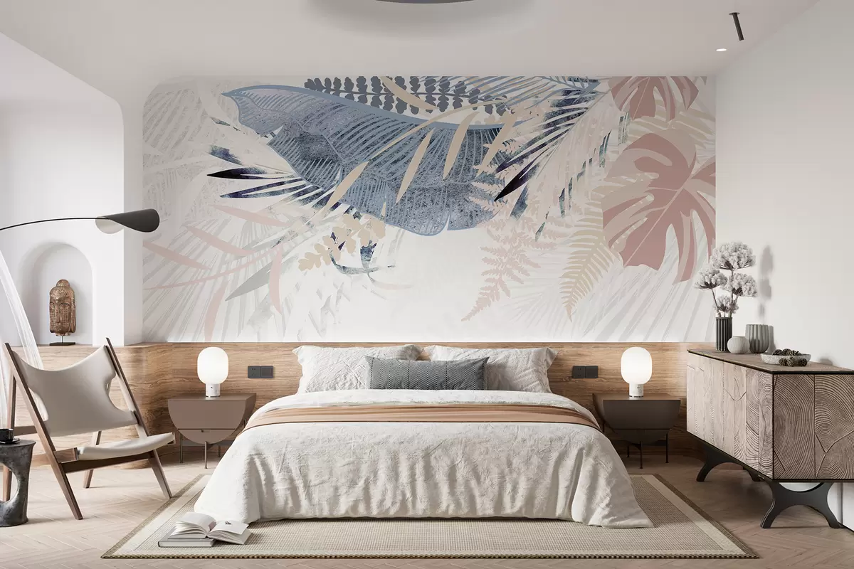 Fotomurales Diseño botánico moderno con textura tropical de hojas de palma con varios tonos de azul, gris y rosa. Nr. w00908