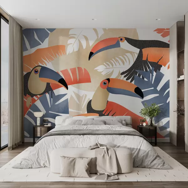 Fotomurales Tucanes en hojas tropicales, color azul, rojo, naranja. Nr. w01008