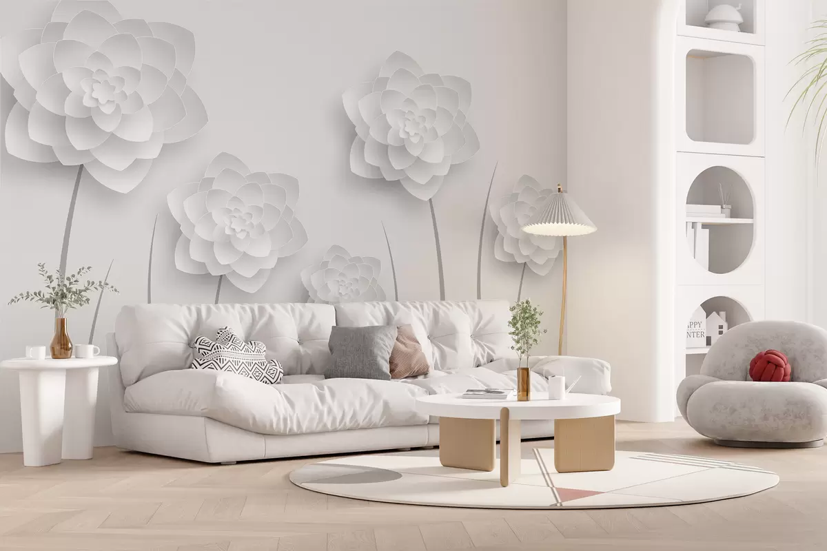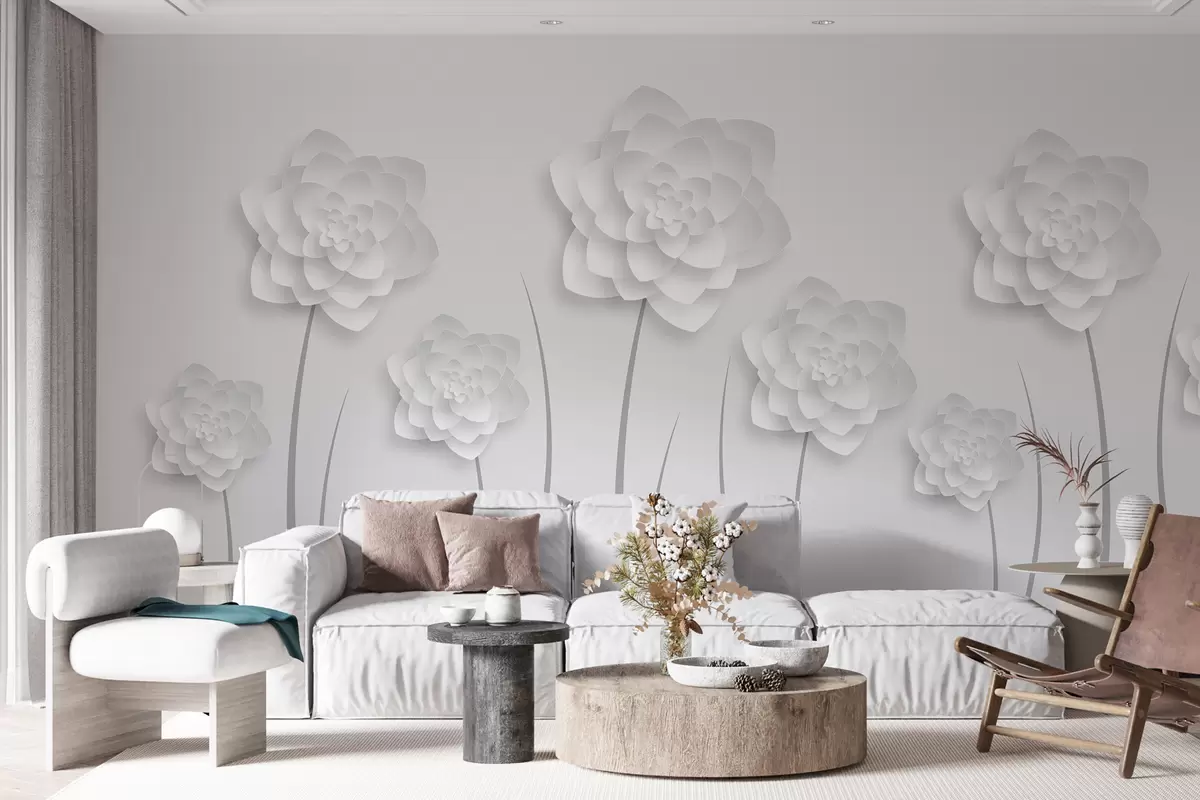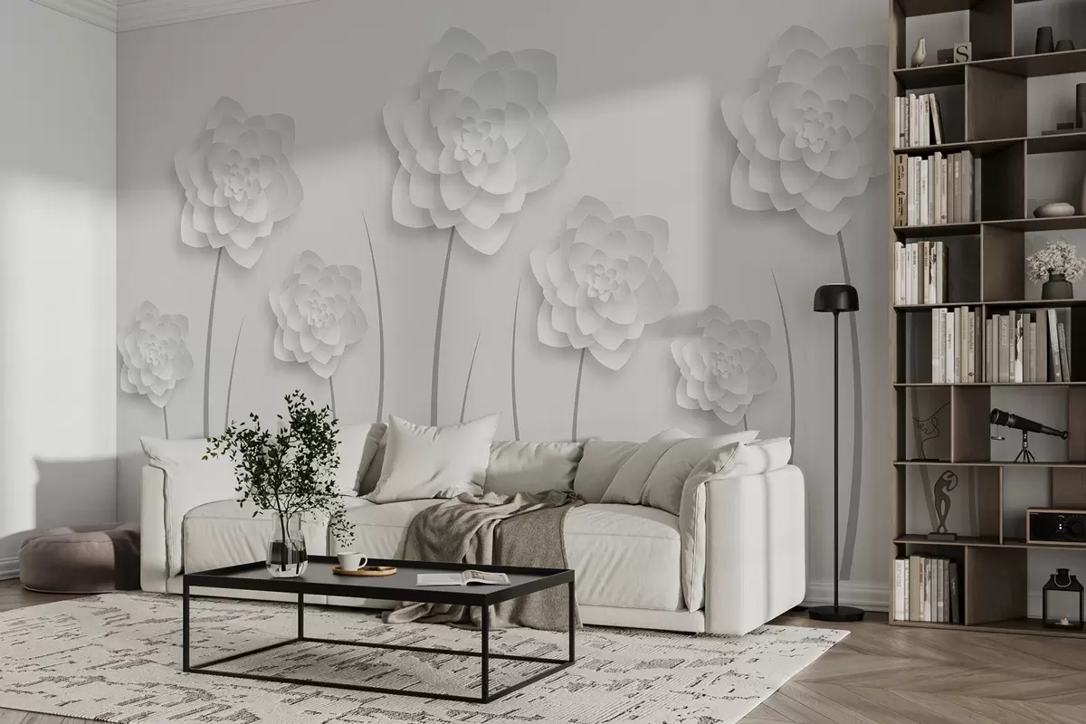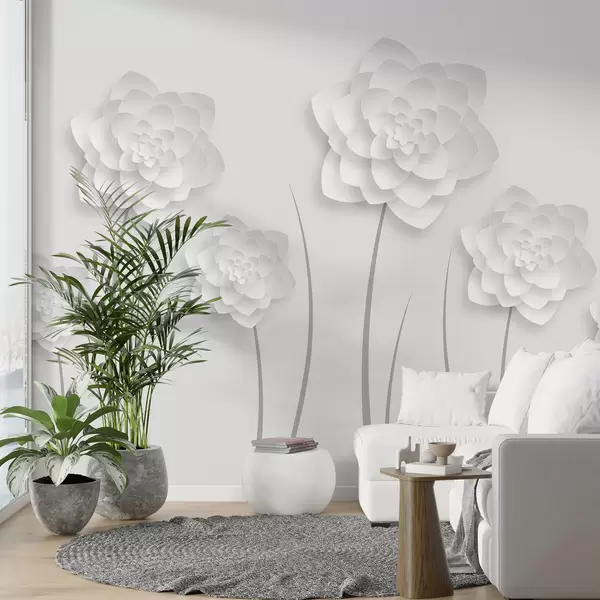 Fotomurales Flores grandes con imitación de volumen en estilo papel sobre fondo gris claro con tallo gris Nr. w01021