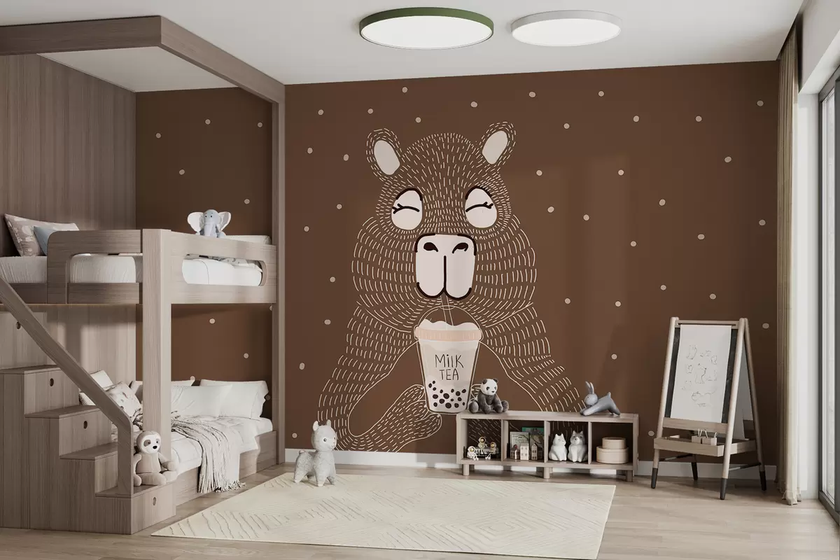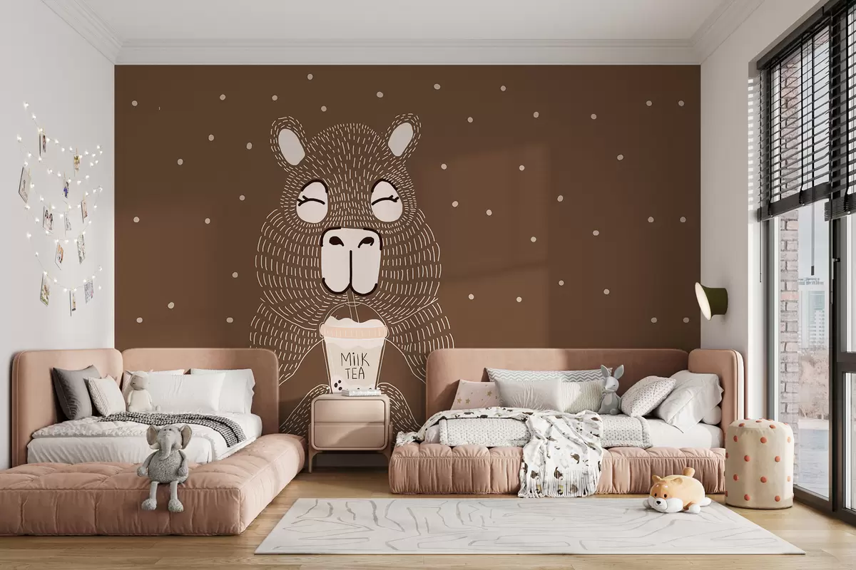 Fotomurales Gran capibara lindo con burbuja tee en estilo minimalista de puntos sobre un fondo marrón de puntos Nr. w01122v2