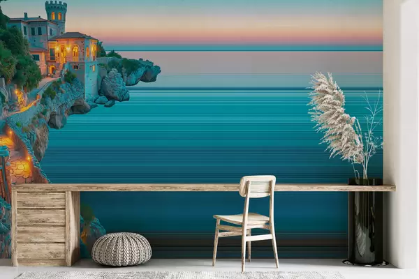 Fotomurales Papel pintado de estilo náutico con una fortaleza y una costa rocosa sobre un fondo multicolor a rayas Nr. w01144