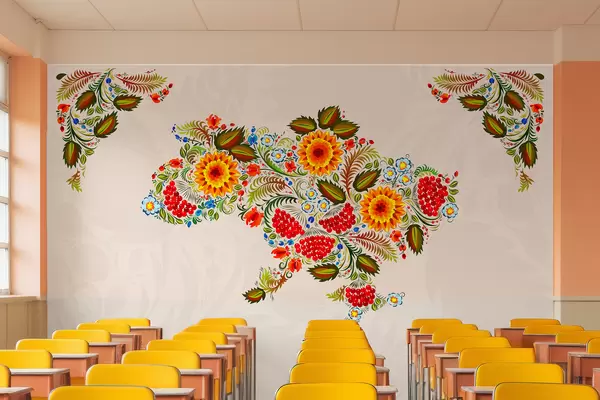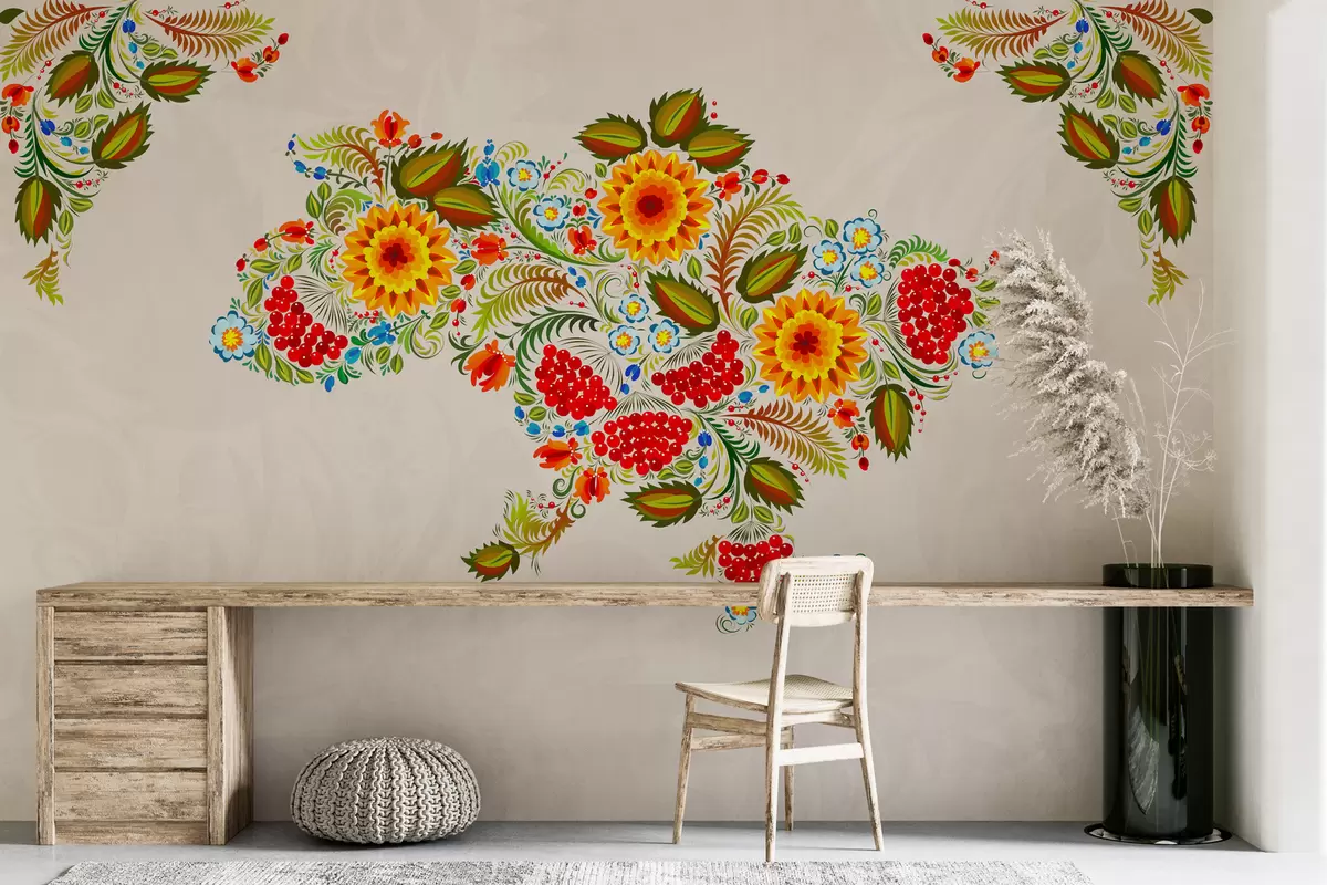 Fotomurales Mapa de Ucrania pintado al estilo de Petrikov sobre fondo beige claro Nr. w01149