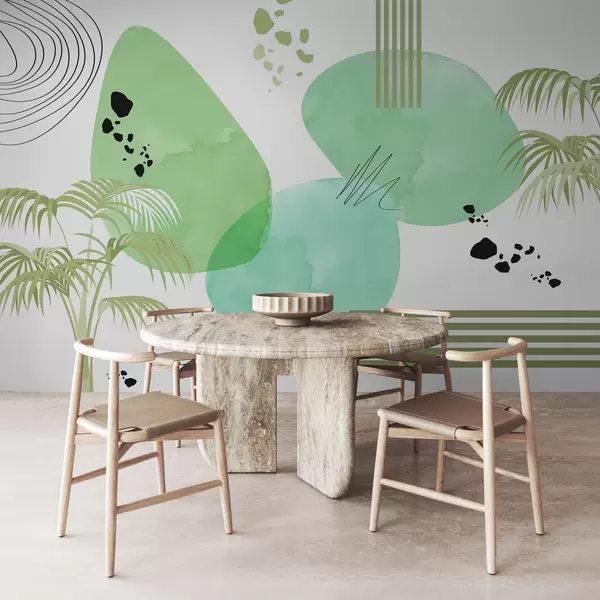 Fotomurales Abstracción boho, manchas de acuarela, rayas, líneas curvas, palmera, color verde Nr. w01199v1