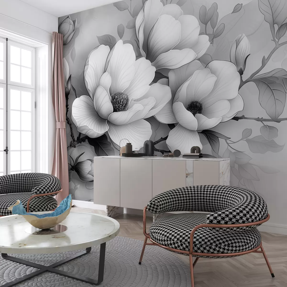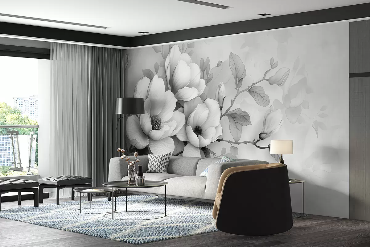 Fotomurales Una ilustración en blanco y negro de una magnolia sobre un fondo gris Nr. w01277