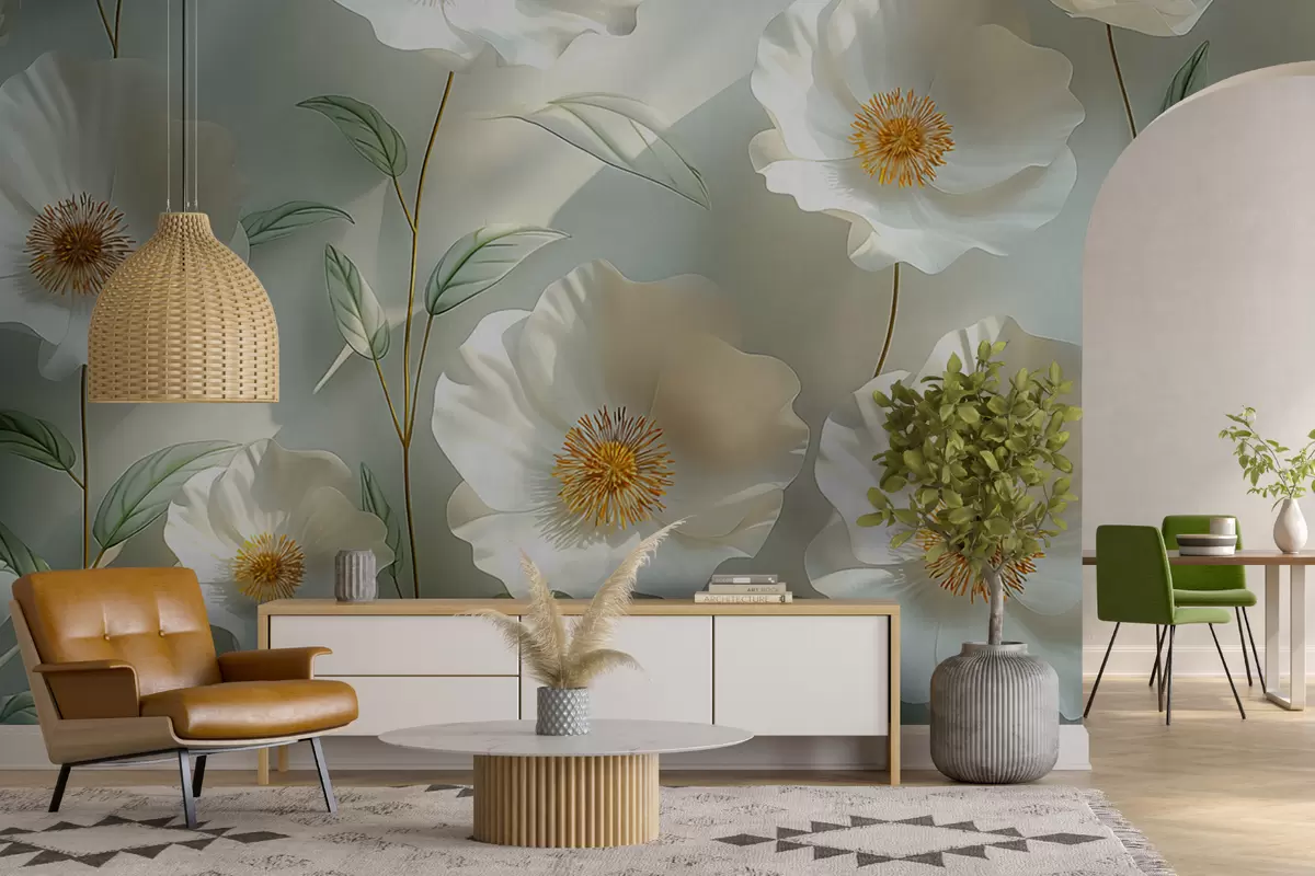 Fotomurales Amapolas blancas contra una pared con luz solar y efecto 3D Nr. w01339