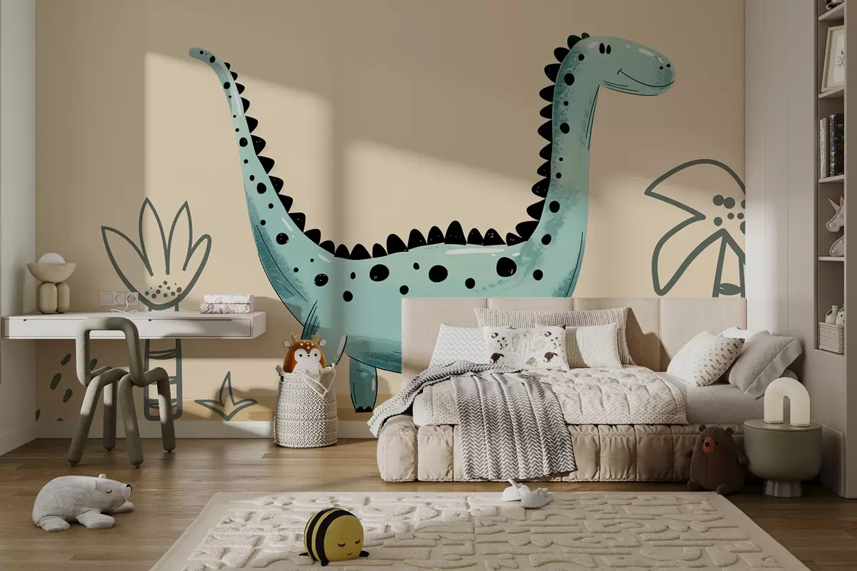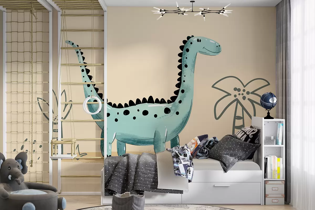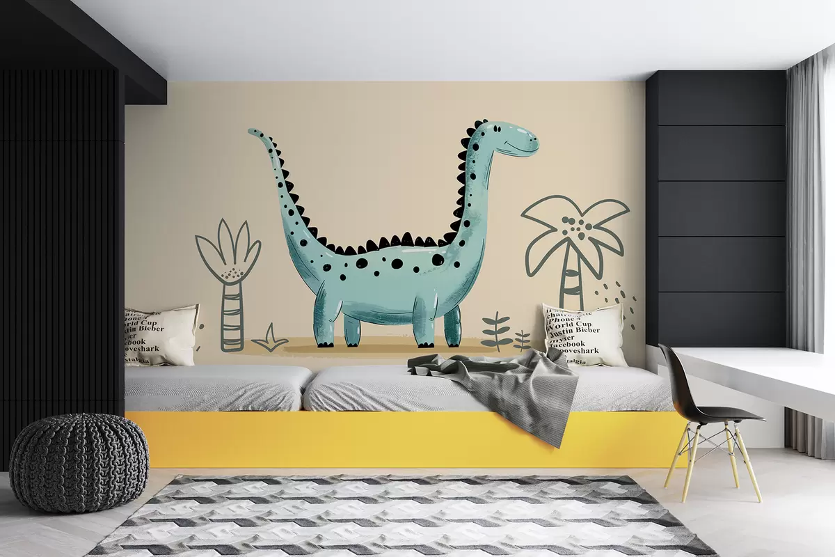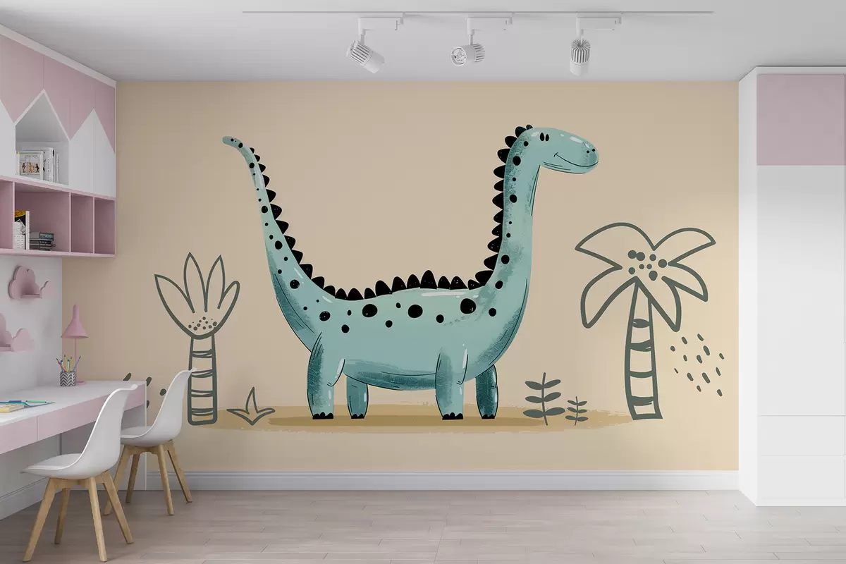 Fotomurales Lindo dinosaurio sobre un fondo beige con palmeras. Nr. w01357v1