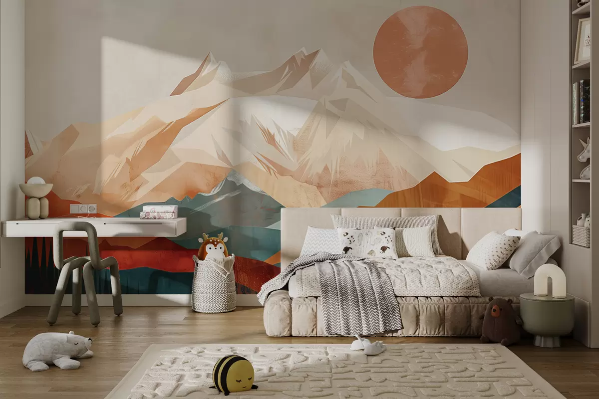 Fotomurales Felicidad boho: un paisaje sereno de montañas, árboles y sol Nr. w01358