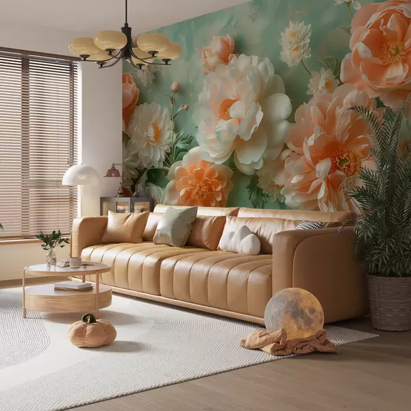 Fotomurales Suave composición de peonías y crisantemos sobre un fondo esmeralda. Nr. w01426