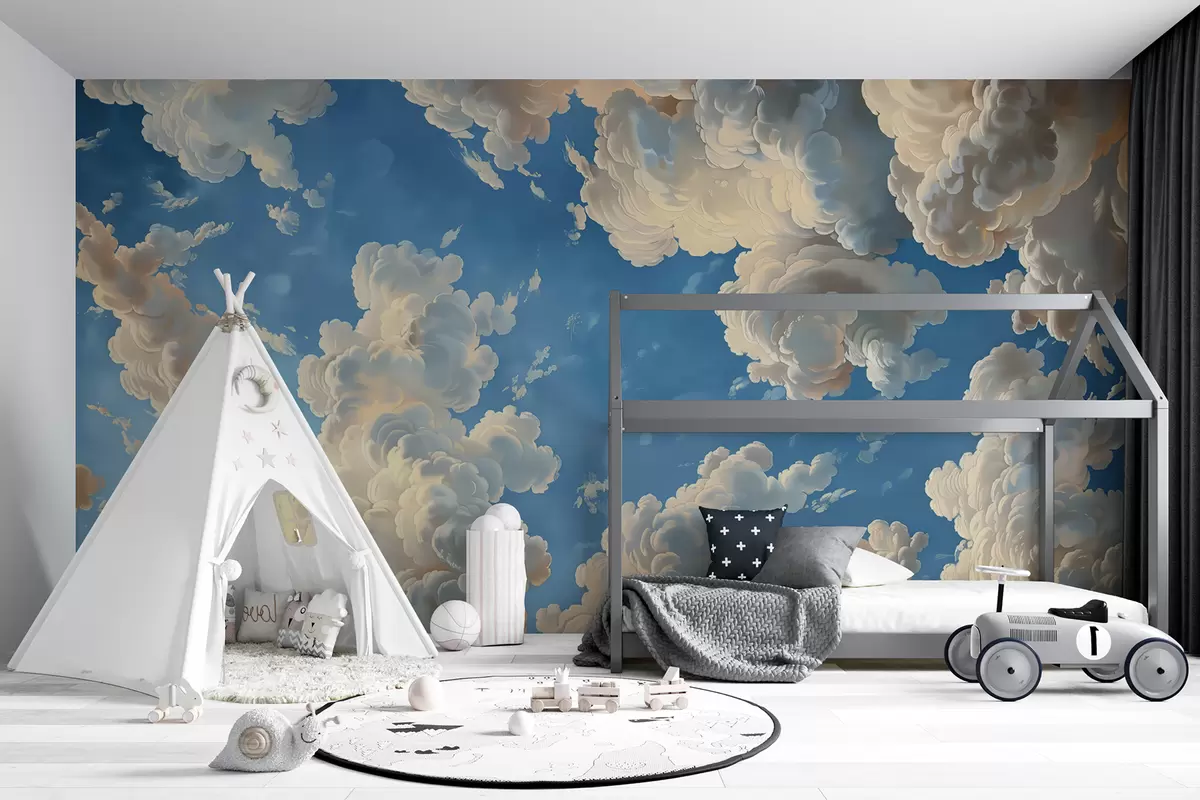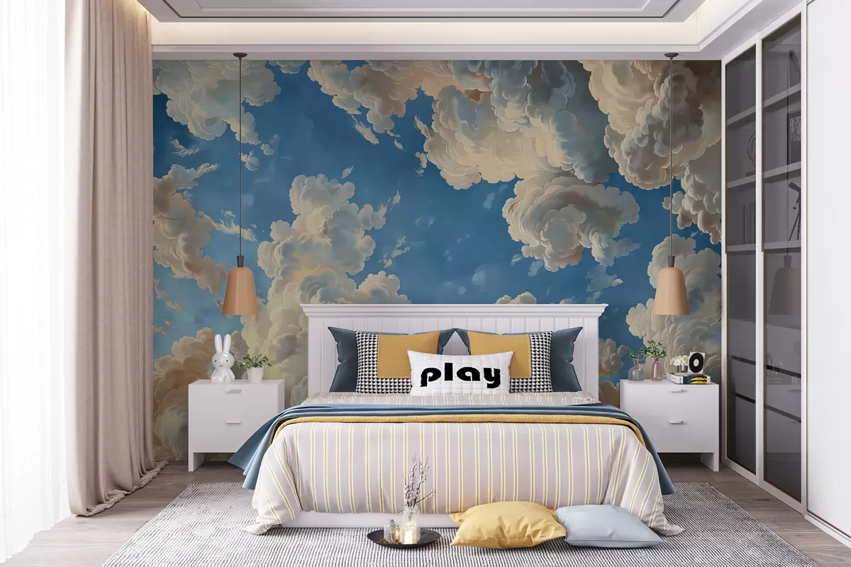 Fotomurales Nubes ondulantes en cálidos tonos crema, melocotón suave y pálido, sobre un cielo azul intenso y vibrante Nr. w01583