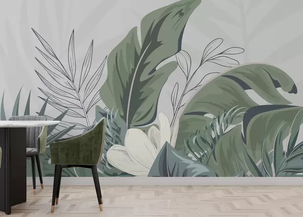 murales de pared Papel pintado Bosque tropical verde de hojas de monstera, palmeras, ramas w01598
