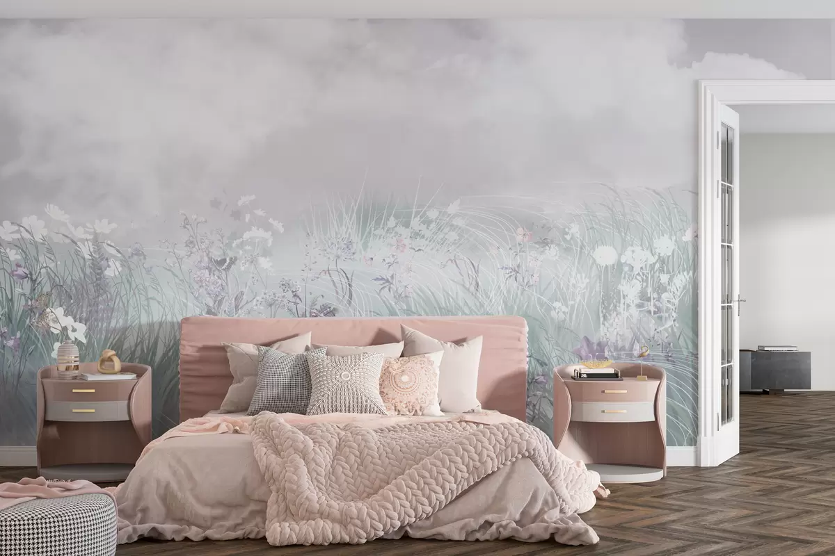 Fotomurales Flores silvestres y hierbas con cielo rosado y nubes Nr. w01624v1