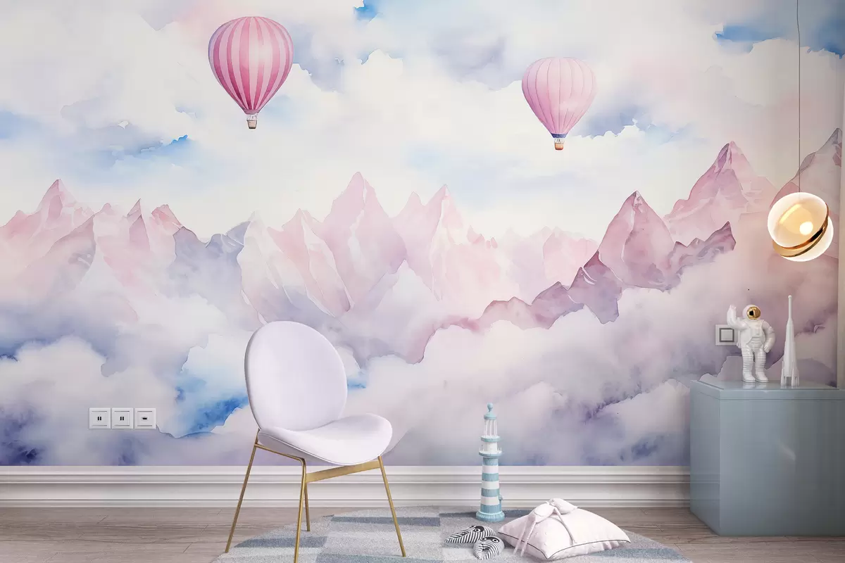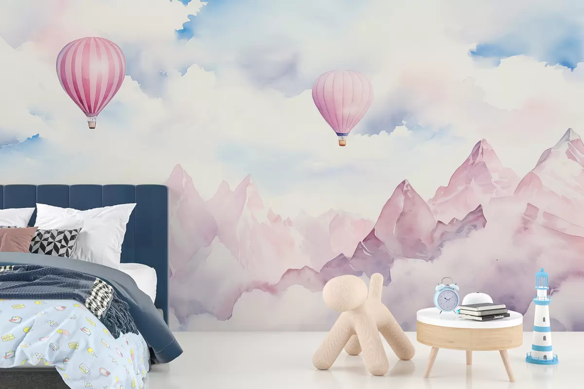 Fotomurales Hermoso paisaje de montañas con globos de aire, acuarela Nr. w01792