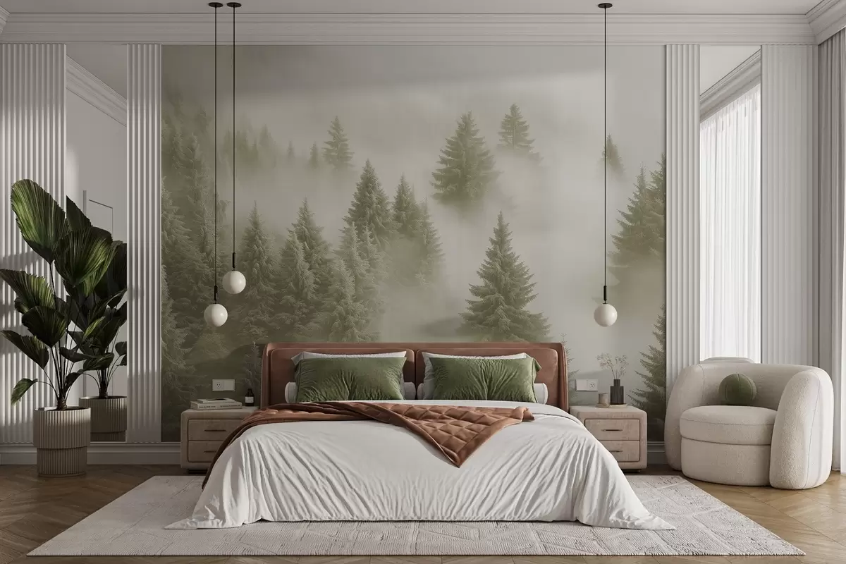Fotomurales Espesa niebla que envuelve un bosque nevado por la mañana en suaves tonos verdes Nr. w02064v2