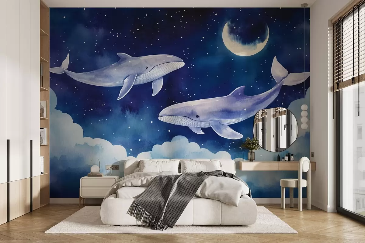 Fotomurales Ballenas en acuarela nadando en un cielo nocturno estrellado con nubes azules Nr. w02070