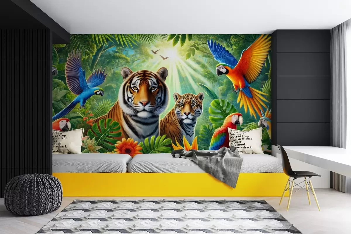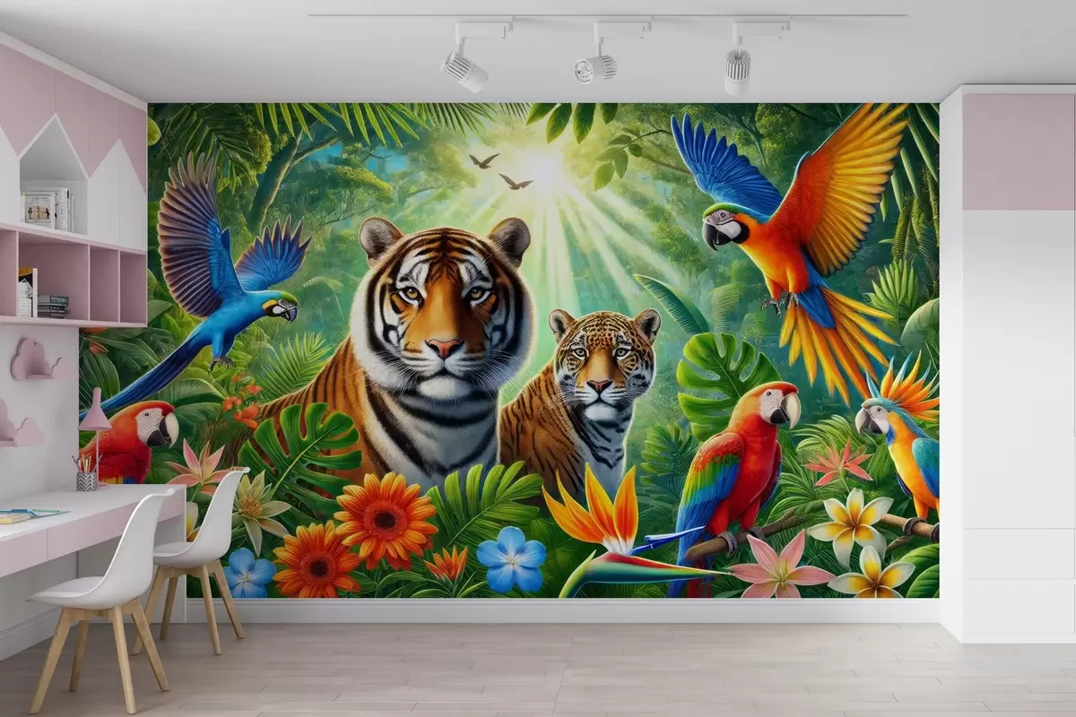 Fotomurales Colorido mural de pared con una panorámica de los trópicos con una pareja de tigres, loros y flores Nr. w02083