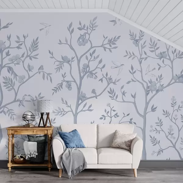 Fotomurales Diseño Chinoiserie con pájaros, árboles sinuosos, frutas y flores en color azul Nr. w02128v2