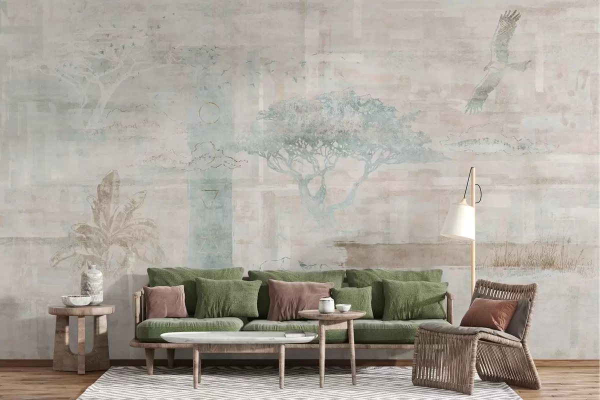 Fotomurales Diseño de efecto grunge vintage con árboles, águila y elementos geométricos Nr. w02130