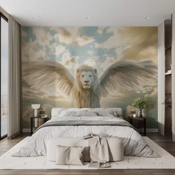 Fotomurales Majestuoso león blanco con una hermosa y exuberante melena blanca y alas contra el cielo Nr. w02144